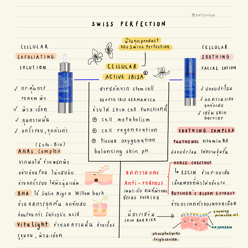 ส่วนตัวมองว่า Swiss Perfection แอบใช้สารเจ๋งๆ อยู่เยอะนะ ถ้ามองแค่ชื่อ Product เราอาจจะไม่ได้รู้สึกหวือหวามากนะ เช่น Exfoliating หรือ Soothing เพราะคิดว่าคงเป็นสารที่เรารู้จัก และพบใน skincare อื่นๆ อยู่แล้วมั้ง แต่พอเข้าไปศึกษา เอ้อ ! น่าสนใจแหะ คือ นอกจาก Cellular Active Irisa แล้ว สารเสริมอื่นๆ ก็น่าสนใจไม่แพ้กัน